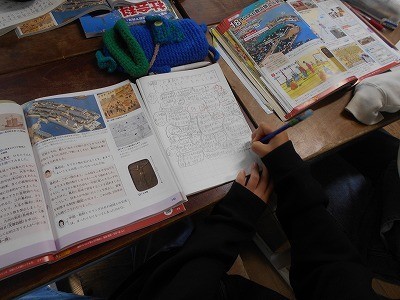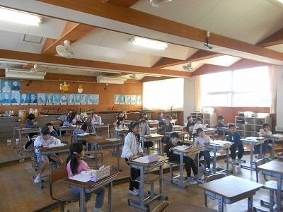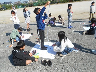4年生の書写です。今日の課題は、「へん」と「つくり」を意識して字形を整えて書くことでした。みんな集中して取り組んでいます。