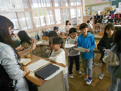 2年生の算数です。九九を正確に言えるように、先生や友達に聞いてもらっています。普通に言ったり逆から言ったり、いろいろな言い方にチャレンジしています。九九マスターを目指してがんばっています。