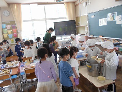 給食が始まって4日目、少しずつ慣れてきて、準備にかかる時間が短くなってきています。