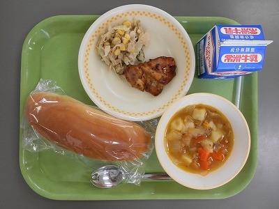 10月7日(火)今日の給食 公開日 2025/10/08 更新日 2025/10/08 学校日誌 〈今日の献立〉〇ミルクロールパン〇牛乳〇鶏肉のハーブ焼き〇ごぼうサラダ〇ミネストローネ今日の写真は3年生です。9月に食の指導で「赤・緑・黄」の食べ物のはたらきについて学びました。「パンは何色?」「ごぼうは何色?」と聞くと、近くの子と相談しながら、「パンは黄色」「ごぼうは緑色」と正しく答えることができていました。