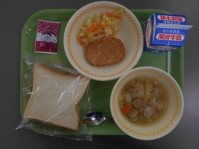 2月13日(金)今日の給食 公開日 2026/02/13 更新日 2026/02/13 学校日誌 〈今日の献立〉〇スライスパン〇牛乳〇チキンハムステーキ〇コールスローサラダ〇ポトフ〇大豆チョコクリーム今日はスライスパンでした。大豆チョコクリームを塗ったり、チキンハムステーキやコールスローサラダをはさんだり、楽しみながら食べていました。