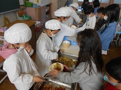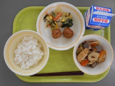 2月26日(木)今日の給食 公開日 2026/03/02 更新日 2026/02/26 学校日誌 〈今日の献立〉〇ごはん〇牛乳〇れんこん入りつくね〇豚肉と大根の煮物〇野菜のごま酢あえ写真は1年生です。当番以外の児童が、配膳されたお皿をみんなで積極的に配ってくれるので、準備がとても早く終わっています。大きいおかずの列に並んでいても、「ごはんが溜まってきたからごはん配ろう」と、様子を見ながら動ける姿がすてきです。