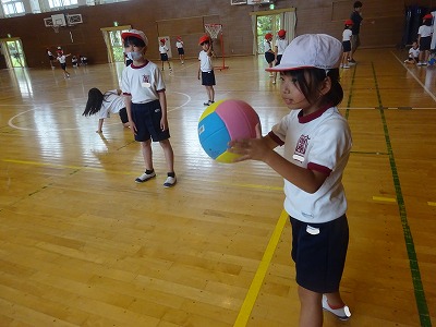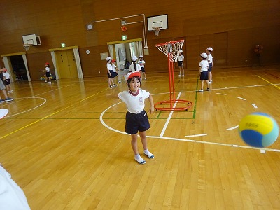 2年生の体育では、ボールを使ったゲームの練習が行われていました。バスケットゴールのようなカゴにシュートをするゲームです。今日はグループに分かれてパスの練習をしていました。高くあがったボールをキャッチすることはなかなか難しいですね。どんどん練習して、少しずつ上達していきましょう。