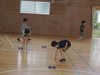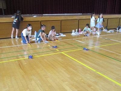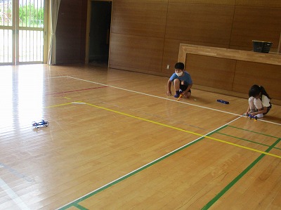 理科の授業で、風やゴムの力について、車のキットを活用して学んでいます。今日は、ゴムの力を使って、車を走らせてみました。