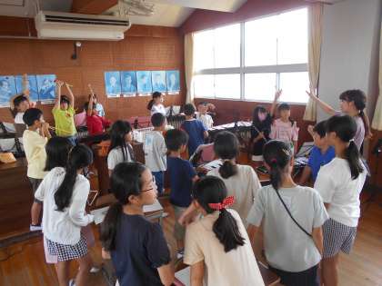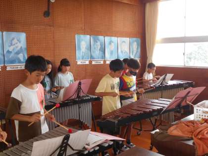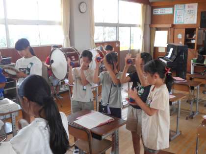 音楽室からミッキーマウスマーチが聞こえてきました。4年生の音楽です。子どもたちが集まって、木琴・鉄琴やトライアングル、太鼓などいろいろな楽器を使って演奏しました。
