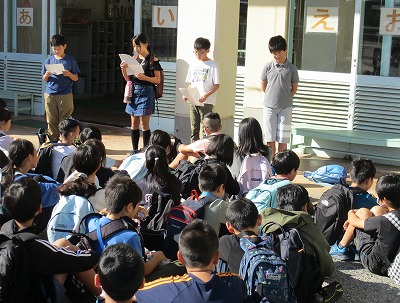 今日、5年生は校外学習です。社会科の学習内容に関連して、日本製鉄と三菱自動車工業岡崎製作所に行き、実際に目で見て学んできます。実行委員の司会で出発式を行い、出発です。