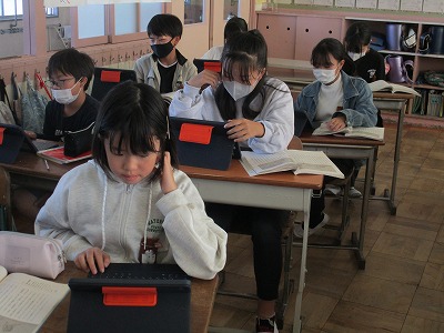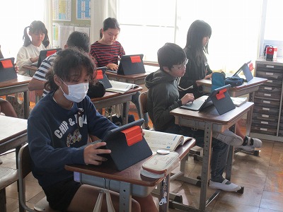 「『鳥獣戯画』を読む」という教材を使い、筆者の表現の工夫について学んでいます。子どもたちも「3匹の蛙の絵」の解説を、表現を工夫しながら書きました。みんなが書いた解説を読み合っています。
