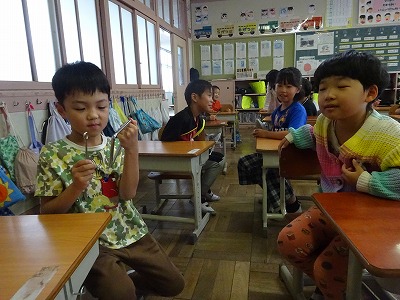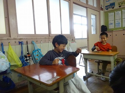 10月16日(月)おんがくの授業【1年】 公開日 2023/10/16 更新日 2023/10/16 学校日誌 1年生の音楽では、トライアングルを使った学習をしていました。友達や先生の鳴らした音をよく聞き分けて、よびかけっこをしたりまねっこをしたりしていました。
