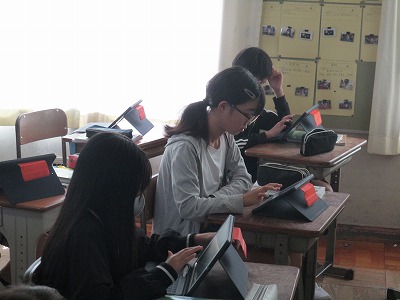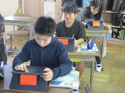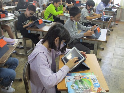 理科の授業で、川の上流と下流の違いについて、検索した画像を使って調べています。堆積物や川幅など、様々な違いに着目し、流れる水の働きについて学習を進めていきます。