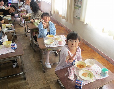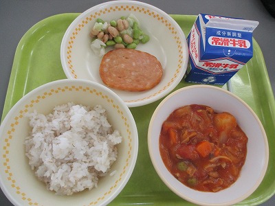 10月16日(月) 給食 公開日 2023/10/16 更新日 2023/10/16 学校日誌 <献立> ○麦ごはん ○牛乳 ○きのこのハヤシライス ○チキンハムステーキ ○まめまめサラダ きのこには「ビタミンD」という栄養素が含まれます。ビタミンDは、カルシウムの吸収を助ける働きのある栄養素です。カルシウムは骨や歯の材料になったり、筋肉の動きを助けたりするなどたくさんの働きがあります。成長期にも欠かせない栄養素であるため、ビタミンDの力も借りていきたいですね。