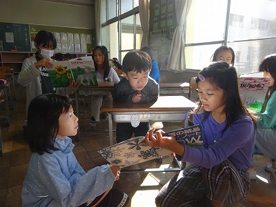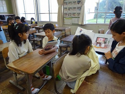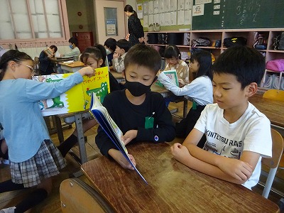 10月18日(水)ペア読書【2年・4年】 公開日 2023/10/18 更新日 2023/10/18 学校日誌 朝の読書タイムで、4年生が2年生に読み聞かせをする「ペア読書」が行われました。4年生はペアの子が喜びそうな本を選び、一生懸命に読んでいました。2年生も真剣な表情で、4年生の読み聞かせを聞いていました。心があたたまる場面でした。