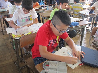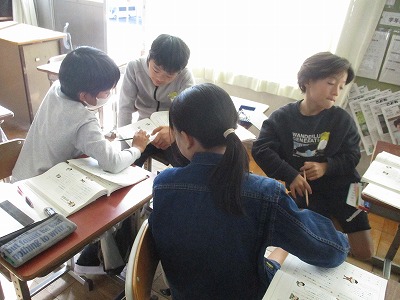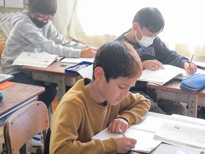 国語の教科書に何回も出てくる「カンジー博士」。今回は、「暗号解読」として、読み方が同じ漢字をテーマに学習します。近くの子とも相談しながら、当てはまる漢字を思い出しています。