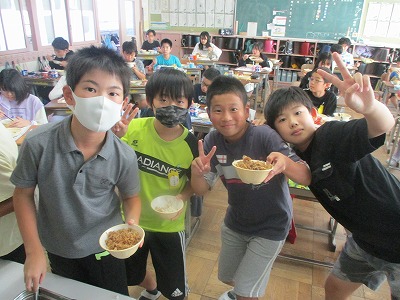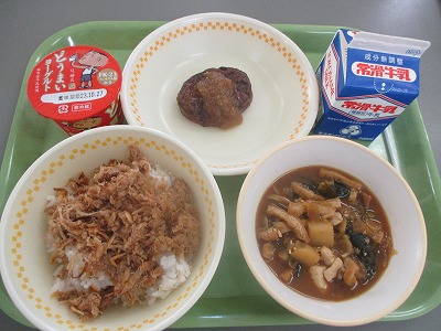 毎月19日は食育の日です。今日は大葉が入ったハンバーグにおろしだれをかけたさっぱりとした主菜でした。中国には、お腹を壊した少年にしそを食べさせたところ、元気を取り戻したという話があり、「紫」の葉で命を「蘇」らせたということから「紫蘇(しそ)」と書くようになったそうです。