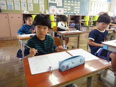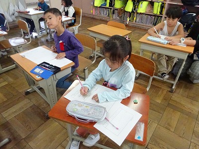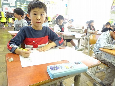 1年生が書写コンクールに取り組んでいました。お手本を見ながら、一文字一文字、真剣に書いています。
