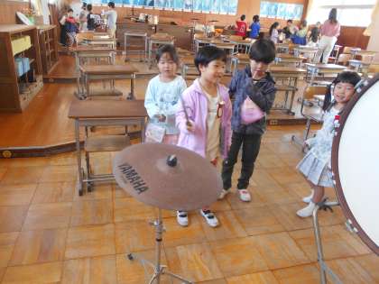 10/23(月)いろいろなおとをみつけよう【1年】 公開日 2023/10/23 更新日 2023/10/23 学校日誌 音楽室の前を通ると、様々な楽器の音が聞こえてきました。1年生の音楽の「いろいろなおとをみつけよう」という学習の最中でした。太鼓やシンバルを嬉しそうに叩いている姿が、微笑ましく感じました。