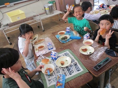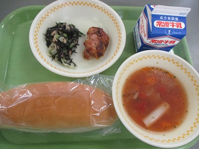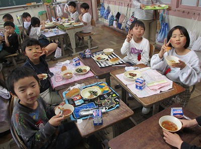 4月18日(木) 給食 公開日 2024/04/18 更新日 2024/04/18 学校日誌 <献立> ○ミルクロールパン ○牛乳 ○鶏肉のハーブ焼き ○ひじきのサラダ ○米粉マカロニ入りミネストローネ 鶏肉のハーブ焼きは児童に大人気です。ある学級のグループでは、ハーブ焼きのような好きなものは、最初に食べる派か、それとも最後に食べる派かの会話が盛り上がっていました。 写真は2年生です。