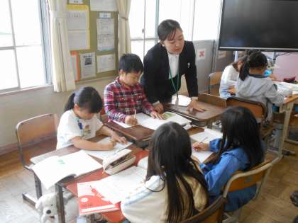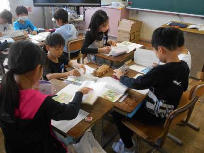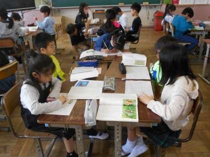 3年生の国語では、「春をたどって」という読み物の学習をしていました。グループで物語の場面に出てくる登場人物や時間・場所を表にまとめました。楽しそうに話し合いながら活動をしていました。