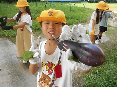 9/4(水)わたしたちのやさいばたけ【2年】 公開日 2024/09/04 更新日 2024/09/04 学校日誌 2年生の生活では、次の野菜づくりに向け、夏野菜の最後の収穫をしたり、畑を耕したりしていました。大きく実ったナスを収穫して満足げな様子がありました。次はどんな野菜を栽培するのか楽しみですね。