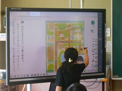 9/5(木)ことばでみちあんない【2年】 公開日 2024/09/05 更新日 2024/09/05 学校日誌 2年生の国語では、「ことばでみちあんない」という単元の学習をしていました。教科書の地図をもとに、自分の考えた場所までの道のりを電子黒板前にいる友達に伝えます。教科書では上や下の方に書いてある物も、実際に道を歩くことを想定すると「左」や「右」を使わないと伝わりにくいことに気付けました。