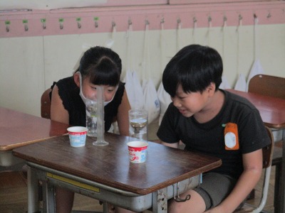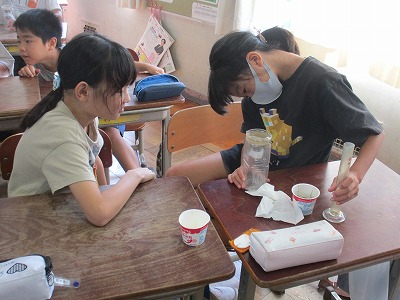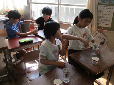 9/6(金)雨水と地面【4年】 公開日 2024/09/06 更新日 2024/09/06 学校日誌 理科の授業で「雨水と地面」の単元の学習を進めています。今日は、「砂利」と「土」で、水のしみ込む速さがどのように変わるのかを調べました。「えっ」「全然違う!」結果に驚いている様子でした。素敵な学びになりましたね。