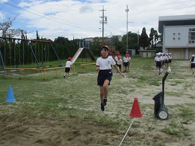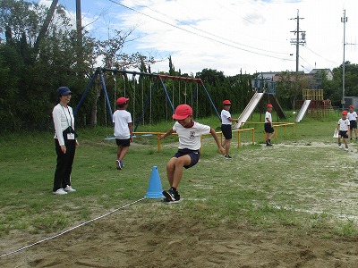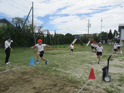 9/10(火)走り幅跳び【5年】 公開日 2024/09/10 更新日 2024/09/10 学校日誌 体育の授業で、走り幅跳びを行っていました。リズムよく助走し、最後のテンポを速くして、強く踏み切ります。スムーズに助走から踏切に繋がるように、何回も練習しています。