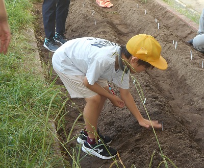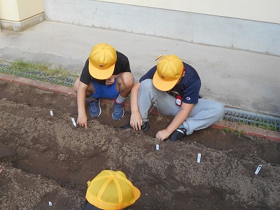 9/11(水)わたしたちのやさいばたけ【2年】 公開日 2024/09/11 更新日 2024/09/11 学校日誌 2年生の生活科では、「わたしたちのやさいばたけ」という単元の学習をしています。先週は畑を耕しましたが、今日はいよいよ大根の種まきです。冬の収穫に向けて、子どもたちは丁寧に種をまいていました。おいしい大根料理が食べられるように、お世話(と観察)を頑張りましょう。