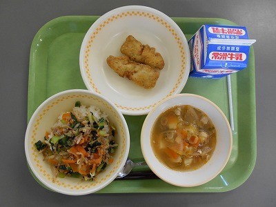 5月8日(木)今日の給食 公開日 2025/05/08 更新日 2025/05/08 学校日誌 <今日の献立>〇ごはん〇牛乳〇あじフリッター〇ビビンバ〇ピリカラ汁今日の写真は2年生です。ビビンバは人気メニューの一つです。多くのクラスでビビンバとごはんの食缶が空っぽになっていました。