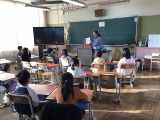 1年生の教室では、先生が読み聞かせをしていました。子どもたちはお話を聞きながら、イメージをふくらませています。