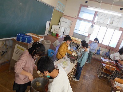 4年生です。冬のかるたを作っています。班ごとに分かれ、みんなで協力して絵札と読み札を作っています。完成して遊ぶのが楽しみですね。