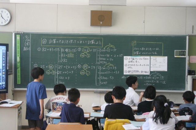 式と計算の順じょ(4の2) 公開日 2025/09/26 更新日 2025/09/26 4年生 4年生の算数の時間・・・計算のきまりを使って工夫して計算しよう!結合法則や分配法則を使った計算をしました。頭をやわらかく使って、ひらめきが必要ですね! +3