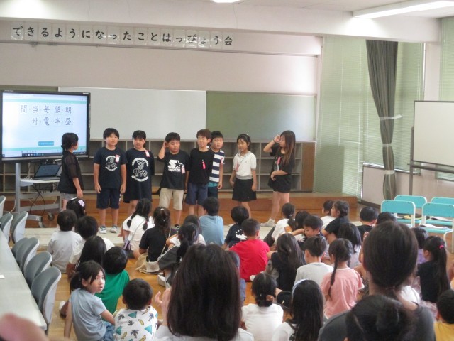 できるようになったこと発表会(2年生) 公開日 2025/09/30 更新日 2025/09/30 2年生 漢字や計算、鍵盤ハーモニカ、マット運動など、2年生になってできるようになったことを発表しました。招待したおうちの人が観客になってくれましたね。最後にサプライズでお手紙を渡しました。