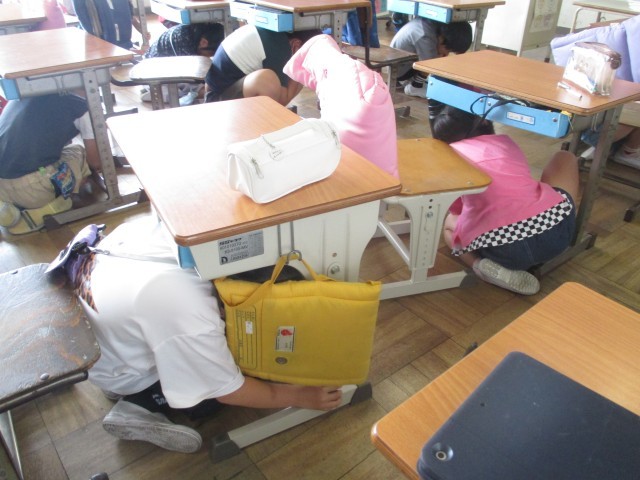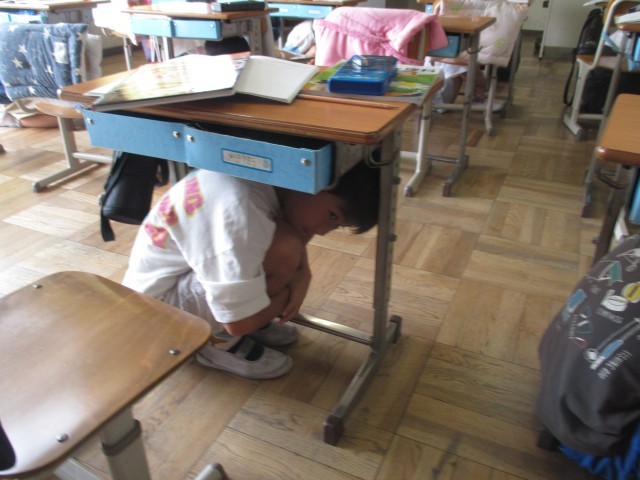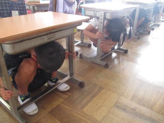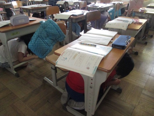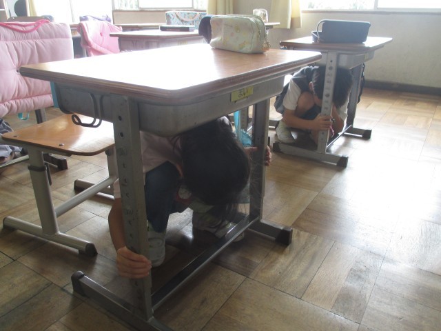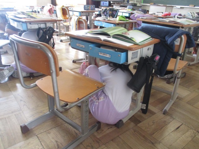 ほとんどの学級が教室で授業をしていたので、素早く机の下にもぐることができていました。