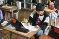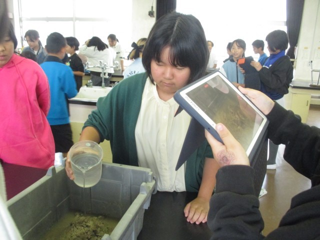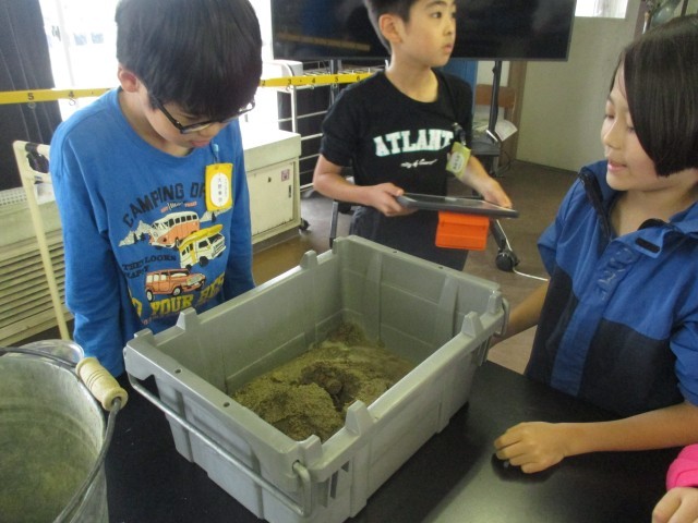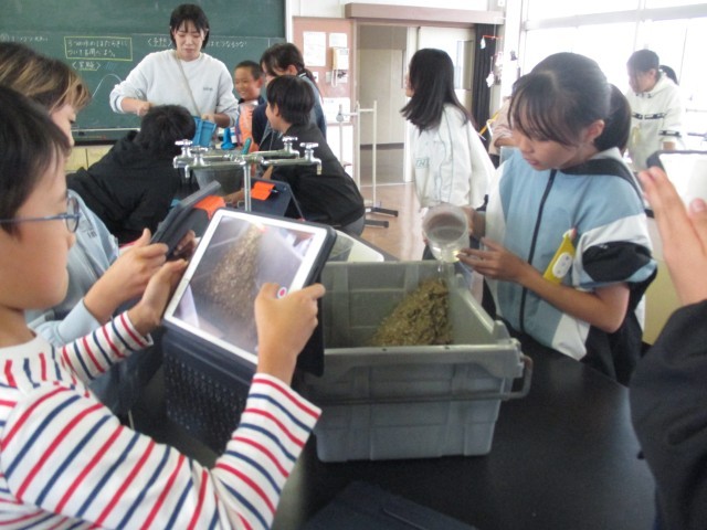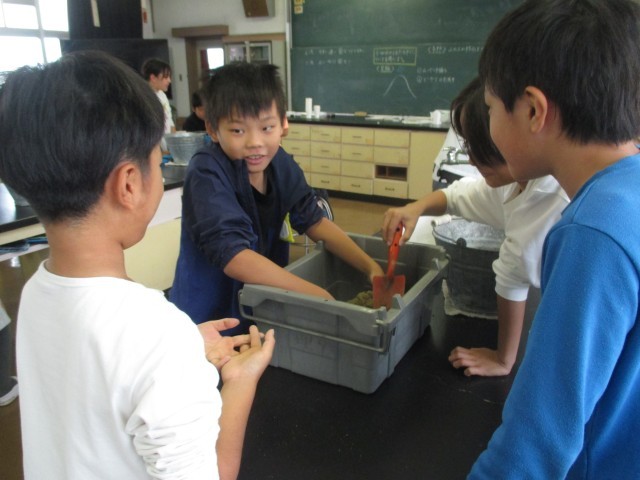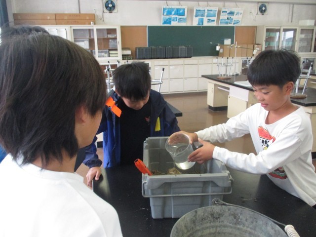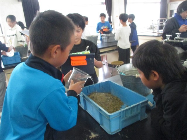 水のパワー!!(5の2) 公開日 2025/10/22 更新日 2025/10/22 5年生 コンテナの中に砂山を作り、上から水をかけるという実験中。山に雨が降ったときの様子の再現です。上から砂や石が転がったり、川ができたり、山が崩れてしまったり・・・。水には、どんなパワーがあるか、分かったかな? +3