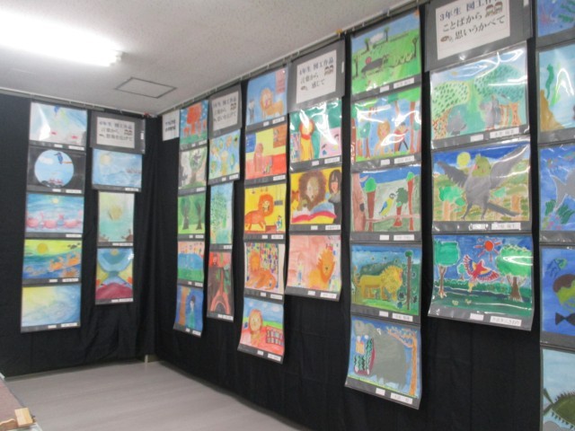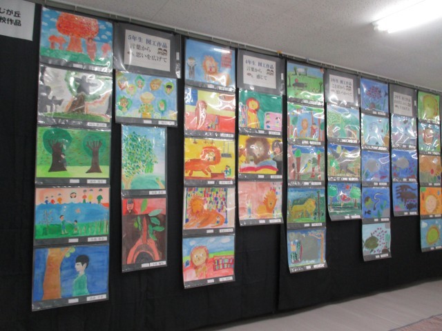小学校からは、図工の授業で制作した絵画を出品しました。センターの2階には、中学校や幼稚園、地域のかたの作品も展示されていました。他にも地域やコミュニティーセンターで○○教室に通っているかた(子)たちの発表もあります。