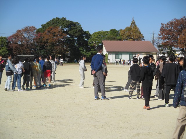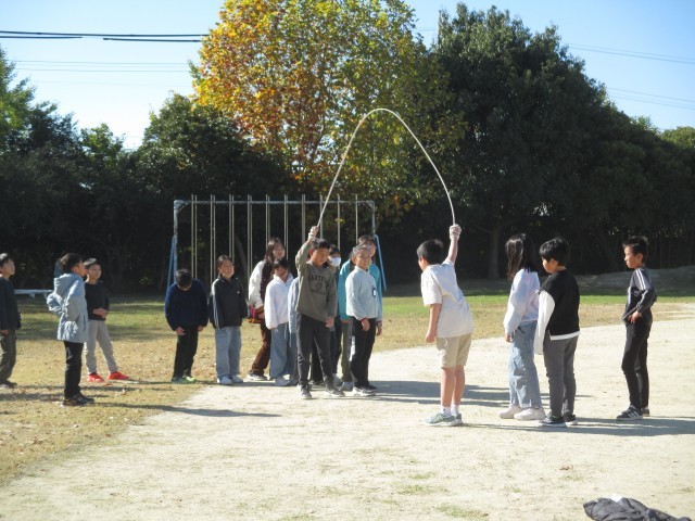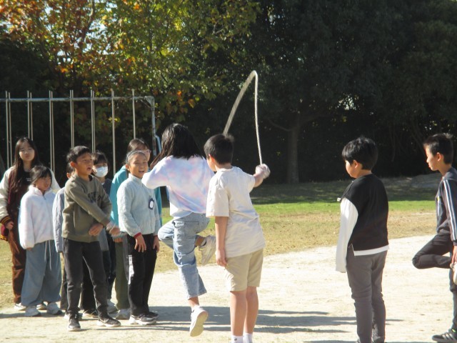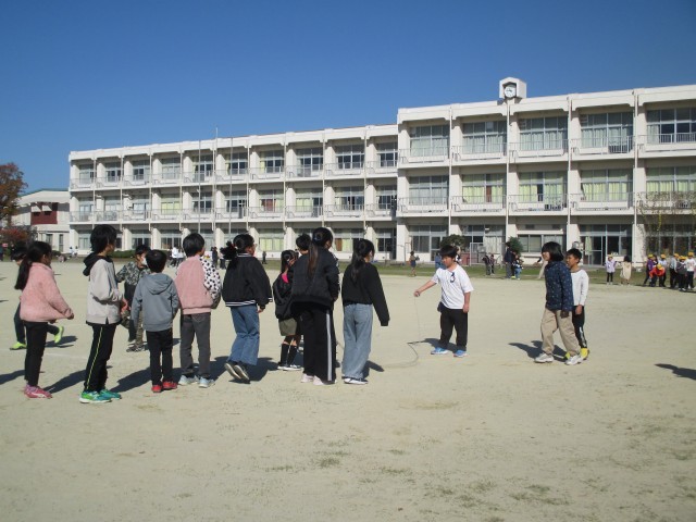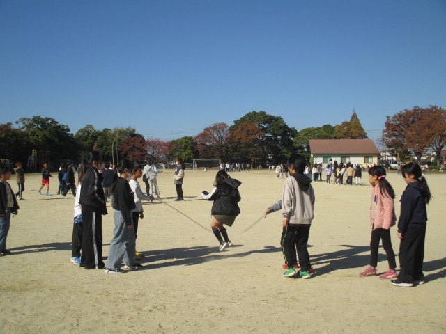大放課になると、学級ごとに大縄跳びの練習をがんばっています。
