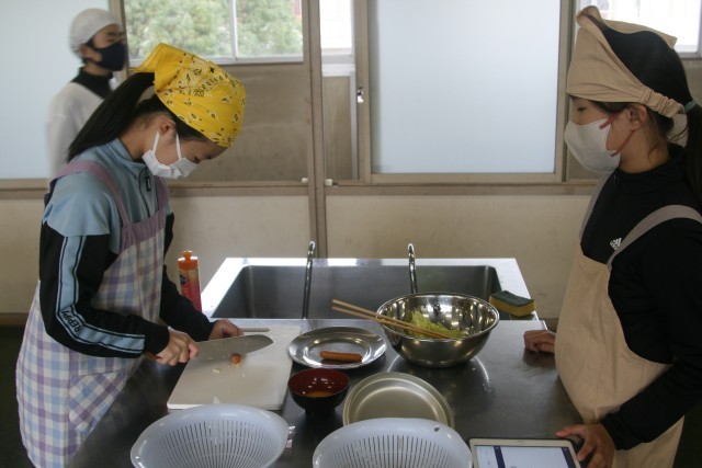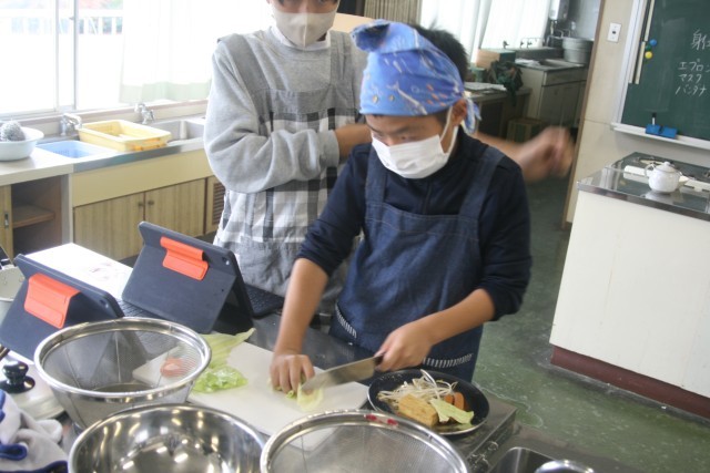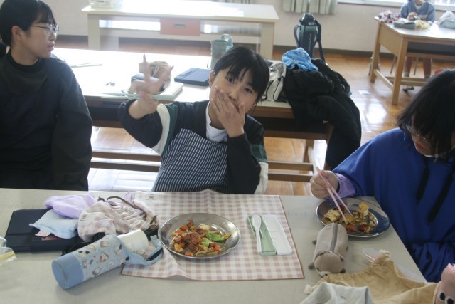 調理実習(厚揚げと野菜のチャンプルー)(6の1) 公開日 2025/12/03 更新日 2025/12/03 6年生 6年生の家庭科の時間・・・調理実習を行いました。メニューは、「厚揚げと野菜のチャンプルー」。自分の分を、自分一人で調理をしました。手際よく、洗って、切って、ゆでて、炒めて・・・おいしそうなチャンプルーができました! +5