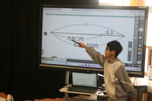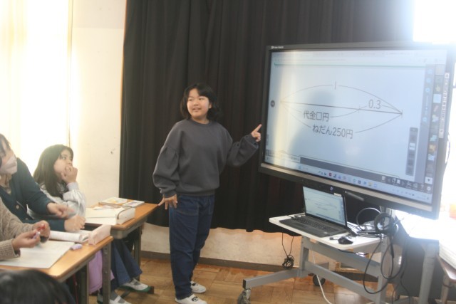 割合(5の2) 公開日 2025/12/08 更新日 2025/12/08 5年生 5年生の算数の時間・・・「割合」の学習をしました。元の値段250円の「3割引」や「30%引」とは、いくらになるのか?お店に行くと、よく聞く言葉ですが・・・どういうことだろう?まずは、自分の考えを説明しました。 +5