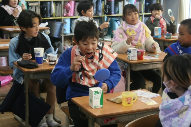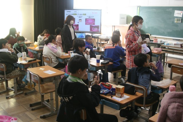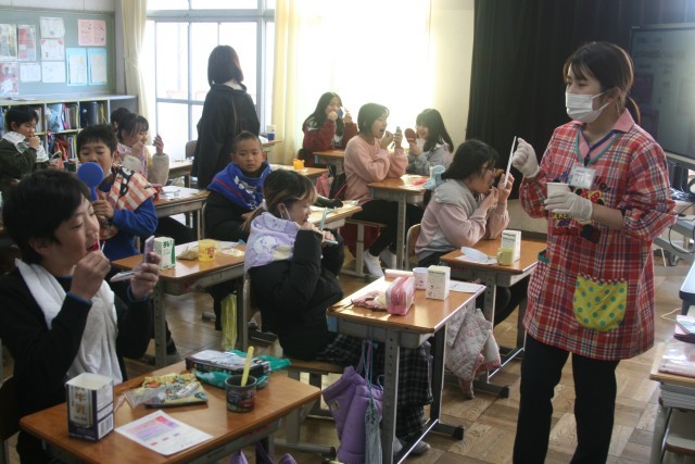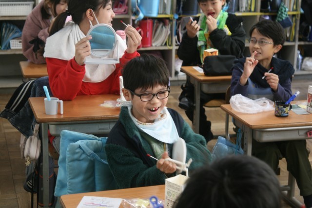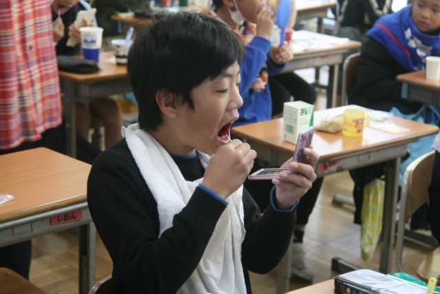 歯磨き指導(5の2) 公開日 2025/12/12 更新日 2025/12/12 5年生 5年生が、歯磨き指導を受けました。久しぶりの染め出しに、「にが~い」顔をしていました。教えてもらいながら、歯磨きを行いました。だいたい7分間くらい歯磨きをしましたが、それでも磨き残しがたくさんあることに気付きました。「普段こんなに時間をかけて歯磨きしていないのに・・・」とこぼしている子が何人かいました。 +5