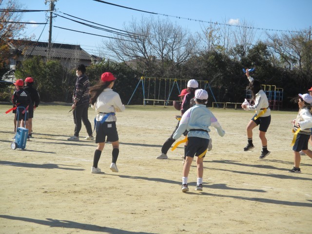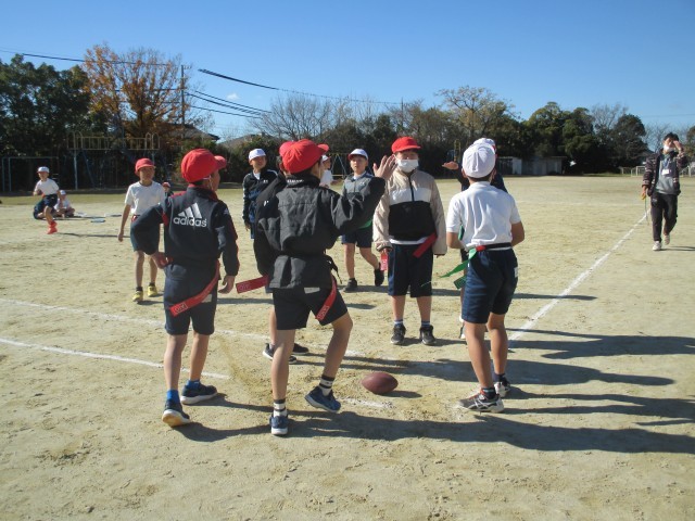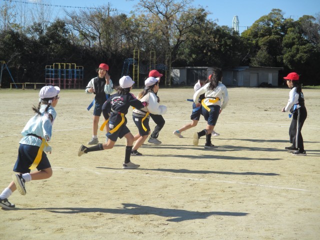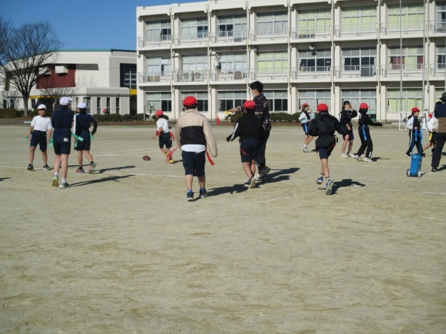 タグラグビー(4年生) 公開日 2025/12/18 更新日 2025/12/18 4年生 腰につけた2本のタグを取られないように、トライするゲームです。しっぽ取りとラグビーの要素を取り入れたゲームです。盛り上がっていました。 +2