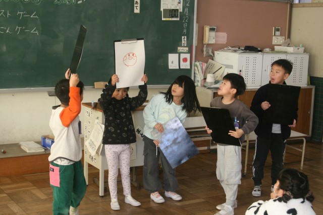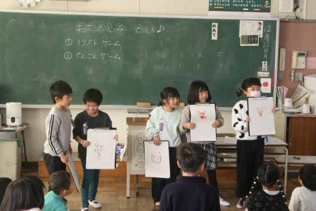 お楽しみ会(1の1) 公開日 2025/12/22 更新日 2025/12/22 1年生 1年生が「おたのしみかい」をおこないました。グループごとにじゅんばんをきめます。おだいをきいて、えをかいて、あてる「イラストゲーム」をおこないました。なかなかの「がはく」がいて、わらいにつつまれていました! +5