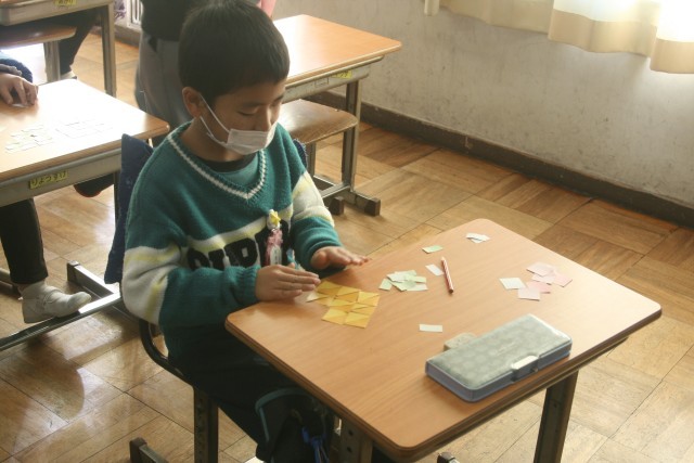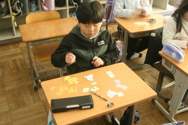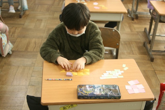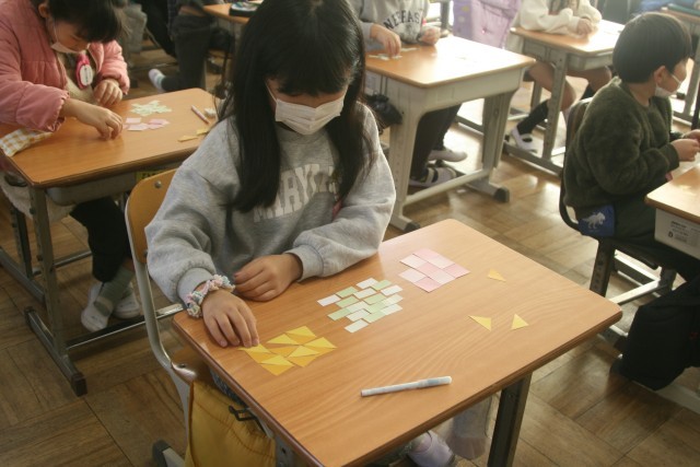 三角形や四角形を組み合わせた模様づくり(2の1) 公開日 2025/12/22 更新日 2025/12/22 2年生 2年生の算数の時間・・・これまでに習った「三角形」や「四角形」を使って、『模様づくり』にチャレンジしました。教科書に載っている図形と同じように並べます。パズルのように、頭をやわらかく使って楽しんでいました! +5