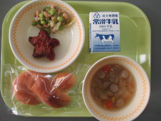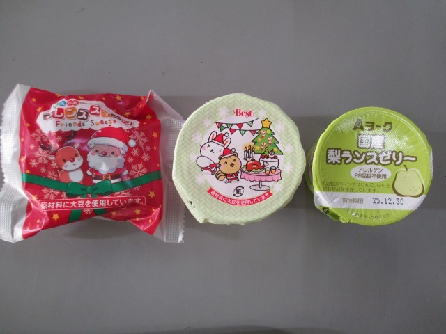 今日の給食 公開日 2025/12/22 更新日 2025/12/22 給食 〔献立〕669kcal〇クロスロールパン〇牛乳 〇もみの木ハンバーグのトマトソースかけ〇ポトフ〇まめまめサラダ【デザートセレクト】左からA、B、Cの順A;ココアといちごのカップケーキB;いちごプリンカップデザートC;国産梨のゼリー☆2学期最後の給食でした。2学期も給食をモリモリ食べて元気に過ごすことができました。 3学期も、感謝して、おいしい給食をいただきましょう。