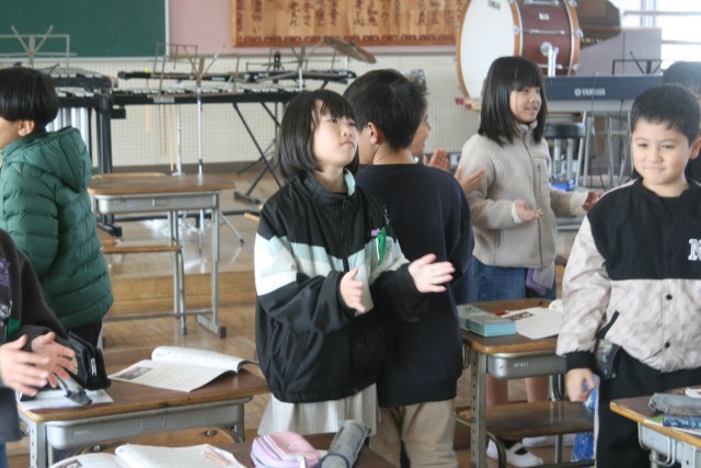 パートの役割を生かして(3の2) 公開日 2026/01/13 更新日 2026/01/13 3年生 「聖者の行進」の曲をパートに分かれて、リズム打ちをしました。行進するには、どのリズムや速さがいいのか、実感していました。 +3
