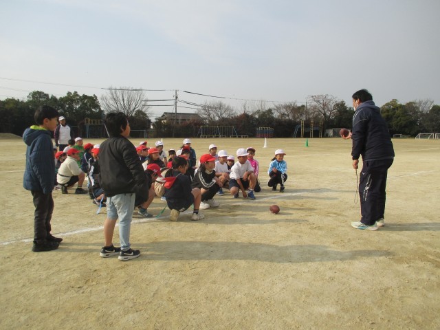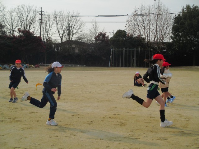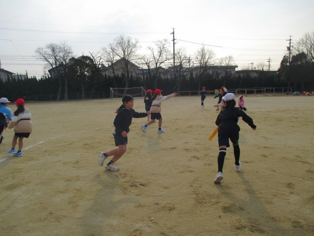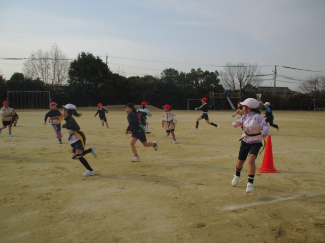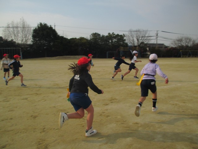タグラグビーの準備運動(3年生) 公開日 2026/01/15 更新日 2026/01/15 3年生 タグラグビーのタグを着けて鬼ごっこをしていました。あくまで、ウォーミングアップ。それでも、十分、楽しんでいました。タグラグビーのルールを先生から聞いて、ますます「早くやってみたい!」と思ったようです。 +3