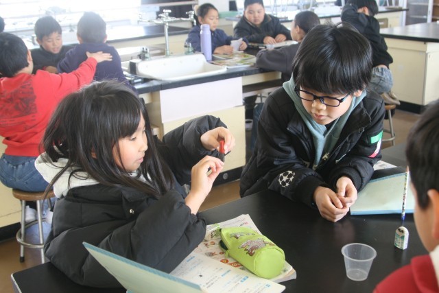 磁石の実験(3の2) 公開日 2026/01/21 更新日 2026/01/21 3年生 3年生の理科の時間・・・磁石の実験を行いました。「釘は磁石に近づけると、磁石に変わるのか」について予想し、実験方法を考え、実験していました。磁石を離しても、「くっついた」・・・歓声があがっていました! +5