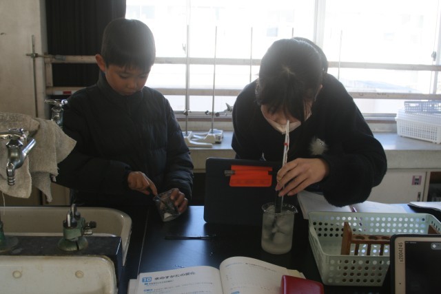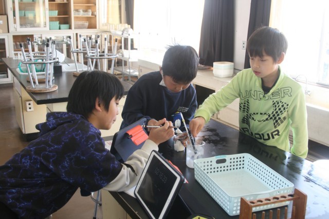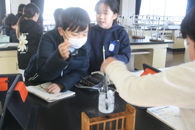 水のすがたの変化(4の1) 公開日 2026/01/22 更新日 2026/01/22 4年生 4年生の理科の時間・・・水のすがたの変化 の学習をしました。水を冷やし続けて、水の温度とすがたの変化を調べる実験を行っていました。タブレットで撮影しながら、時間の経過と温度、水のすがたを記録しています。 +5