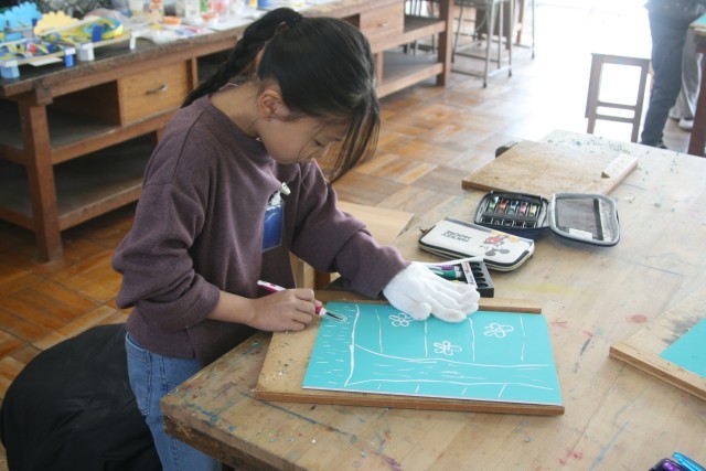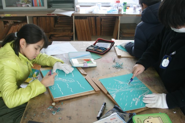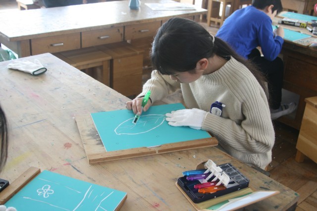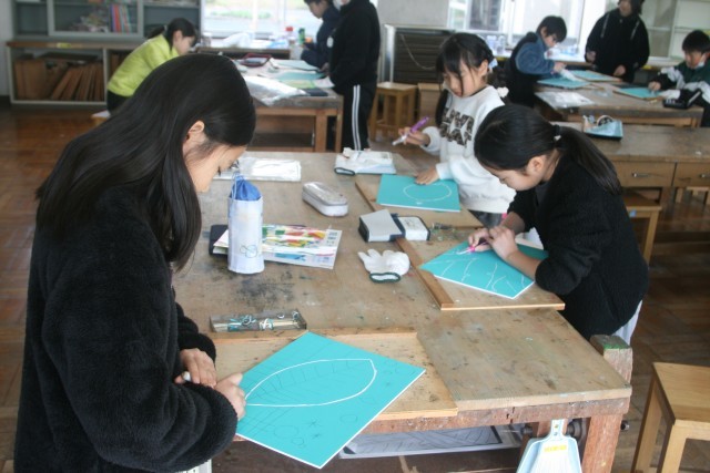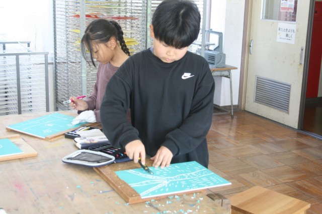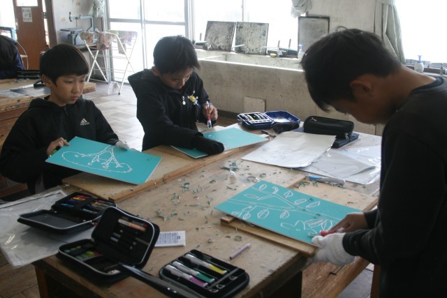 ほって すって 見つけて(4の2) 公開日 2026/01/23 更新日 2026/01/23 4年生 少しずつ、彫刻刀の使い方にも慣れてきました。彫る感覚が楽しいようです。でも、彫りすぎに注意してね。次は、刷る段階に進めるかな。 +5