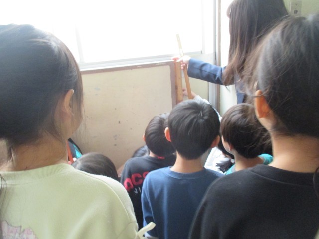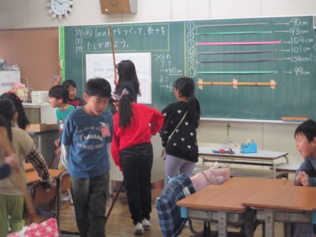 100cmをこえる長さ(2の2) 公開日 2026/01/27 更新日 2026/01/27 2年生 教室の中や廊下の辺りで、100cmをこえる長さを探していました。100cmのものさしを片手に、いろいろ調べてみました。100cmピッタリの場所も見つけました。 +1