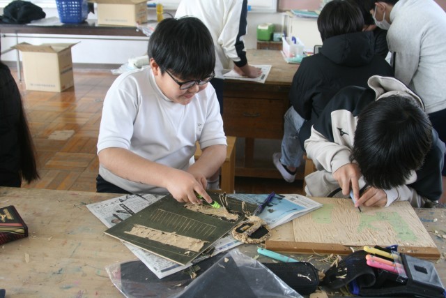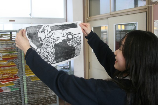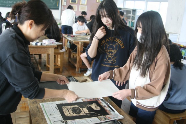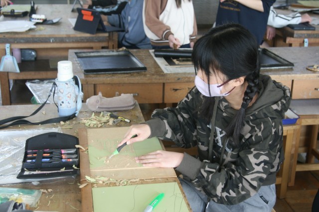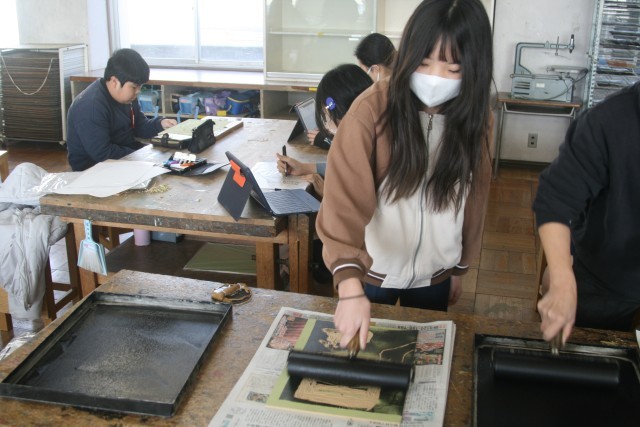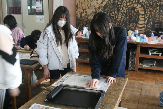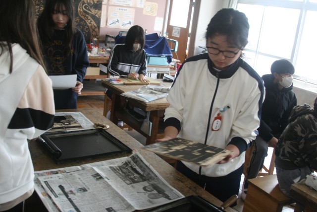 版画(6の1) 公開日 2026/01/28 更新日 2026/01/28 6年生 6年生の図工の時間・・・版画を進めていました。いい感じで刷れた子もいて、完成度の高さに満足感があるようでした。みんなの完成品を並べて鑑賞したいですね! +5