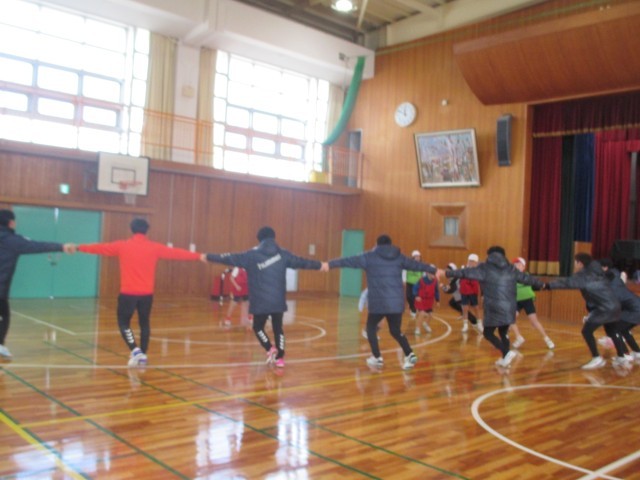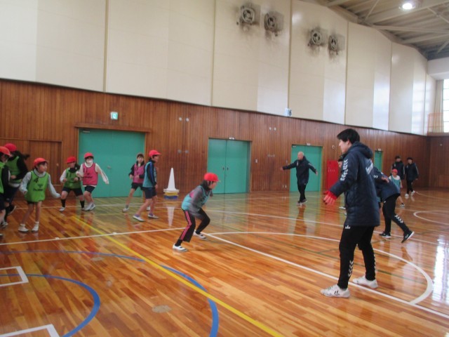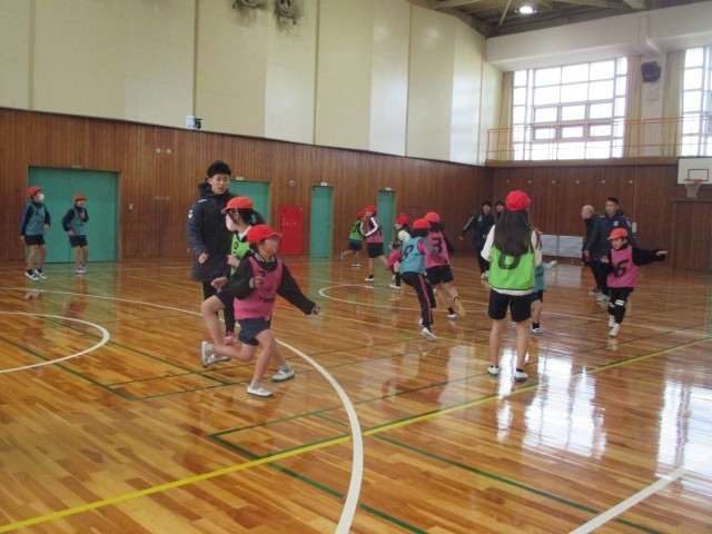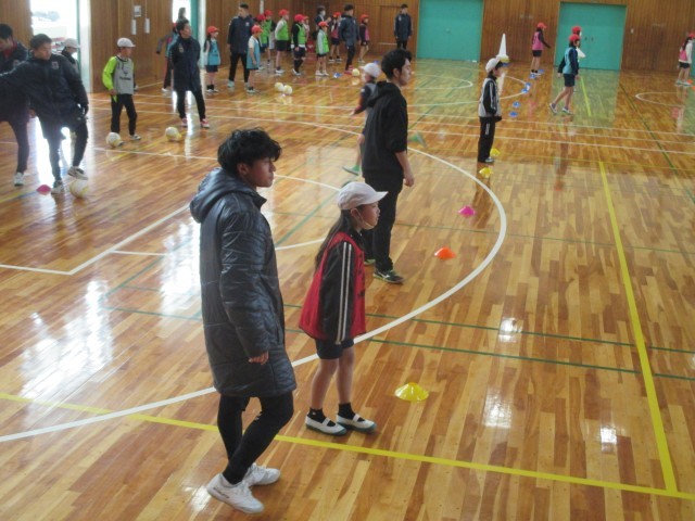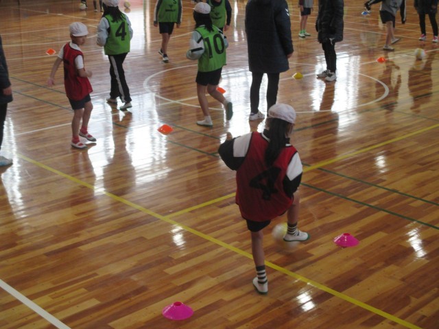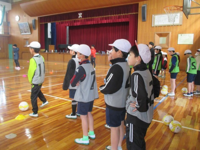 出前授業;フットサル(4年生) 公開日 2026/02/05 更新日 2026/02/05 4年生 名古屋オーシャンズの選手のみなさんと体育の授業をしました。ウォーミングアップで鬼ごっこをして体を温めました。そのあと、ドリブル→パス→パス→シュートの練習をしました。ゴールに入った本数をチーム対抗で競いました。チーム内で応援や声をかけ合う姿もありました。次回は、2週間後です。楽しみです。 +6